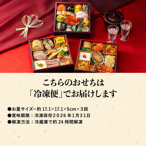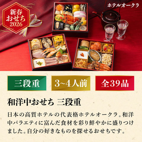 おせち 2026 ホテルオークラ 和洋中おせち 39品 3段重(3人前~4人前 39品)(お届け日12/29)メーカー直送 冷凍便 送料無料 / 和風 洋風 中華風 迎春 本格 おせち料理 2026年 予約 正月 お節 御節 御節料理 福袋