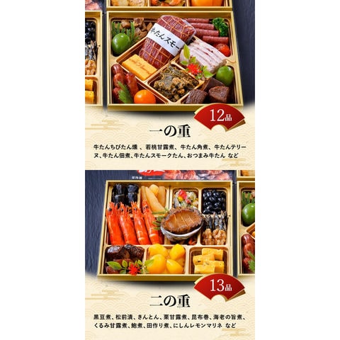 <一の重>牛たんちびたん燻、若桃甘露煮、杏子煮、牛たん角煮、牛たんテリーヌ、牛たん佃煮、牛たんスモークたん(プレーン)、牛たん入玉子焼き、おつまみ牛たん、ブロッコリーコンソメ風、南蛮味噌