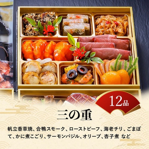<三の重>スモークサーモントラウト、オニオンマリネ、ケッパーベリー、帆立香草焼、合鴨スモーク、ドライトマト赤ワイン煮、ローストビーフ、海老チリ、枝豆ワカメ中華風、筒紅芋甘煮、ごまだんご、花椒くらげ
