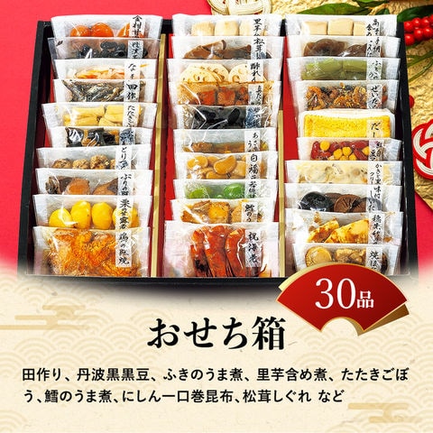 田作り20g、丹波黒黒豆60g、ふきのうま煮50g、里芋含め煮4個、たたきごぼう70g、鱈のうま煮60g、にしん一口巻昆布6本、松茸しぐれ40g、金柑甘露煮70g、栗の甘露煮4個、味付しいたけ5枚、穂先竹の子3切、なます50g、酢れんこん70g、真たらこ角煮70g、ぶりの照焼2切、焼ほたて3個、だし巻150g、手綱こんにゃく4切、高野豆腐含め煮6切、祝海老3尾、あさりのうま煮60g、若桃甘露煮5個、紅白豆マリネ65g、白福豆75g、紫福豆(珈琲味)75g、かきと里芋のクリーム煮85g、ぜいたく煮50g、とりつくね48g、鶏の照焼100g