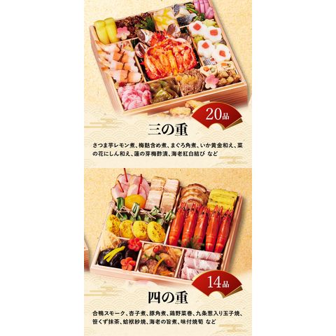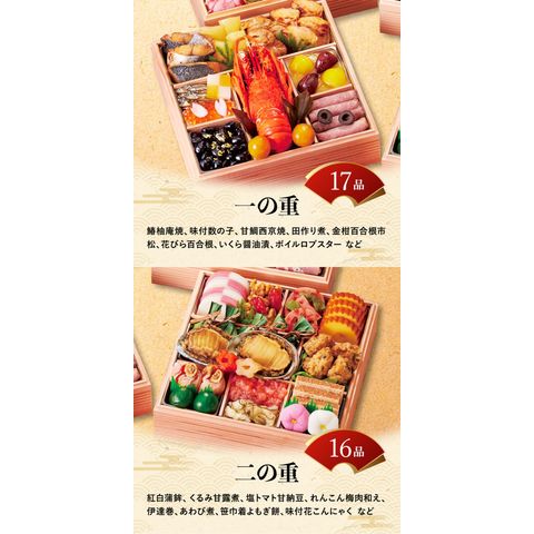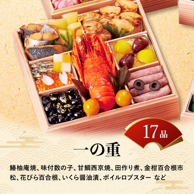 17品目:鰆柚庵焼、味付数の子、焼帆立、甘鯛西京焼、田作り煮、金柑百合根市松、花びら百合根、いくら醤油漬、紅白なます、金箔黒豆煮、ボイルロブスター、金柑甘露煮、栗甘露煮、渋皮栗甘露煮、きんとん、ブラックオリーブ、ローストビーフ