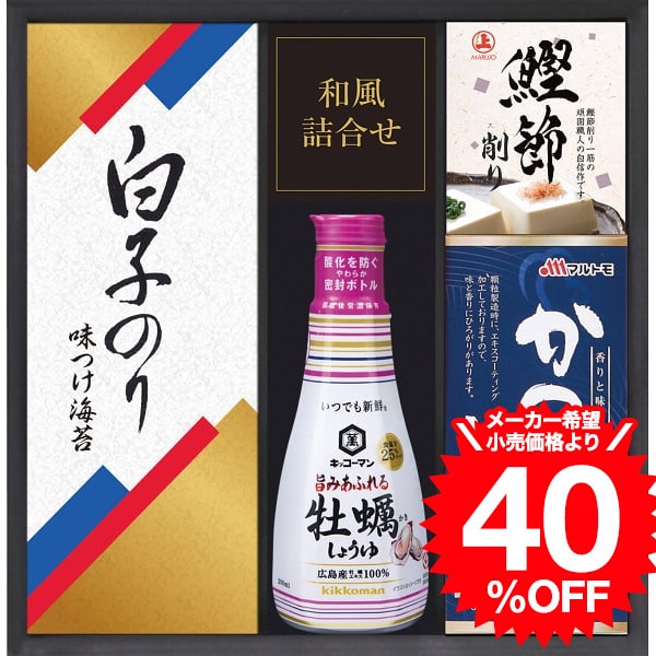●白子味のり(3切5枚)・マルトモかつおだしの素(4g×6)・鰹節削り(1.5g×2)・キッコーマン牡蠣しょうゆ200ml×各1