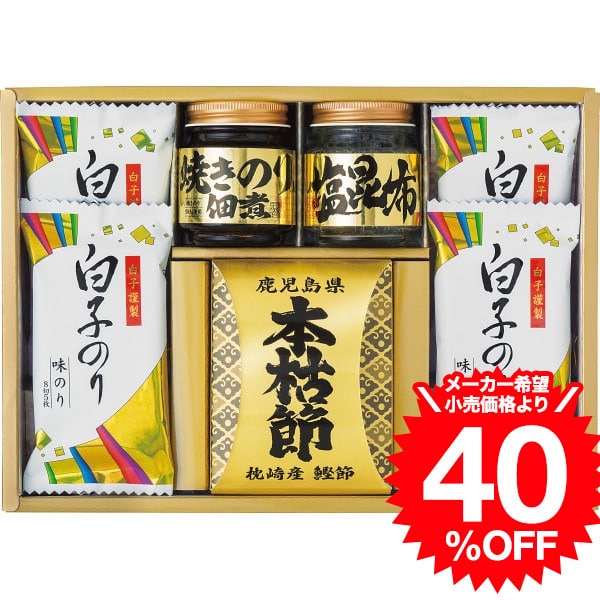 ●鹿児島県枕崎産鰹本枯節(2.5g×2)・塩昆布18g・焼きのり入佃煮85g×各1、白子のり味のり(8切5枚入)×4