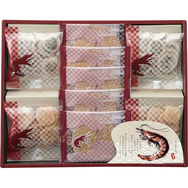 赤えびせんべい(1枚)×5、えびせん(うず巻)10g×2、えびせん(えび松風)10g×2