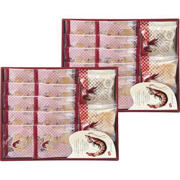 赤えびせんべい(1枚)×20、えびせん(うず巻)10g×2、えびせん(えび松風)10g×2