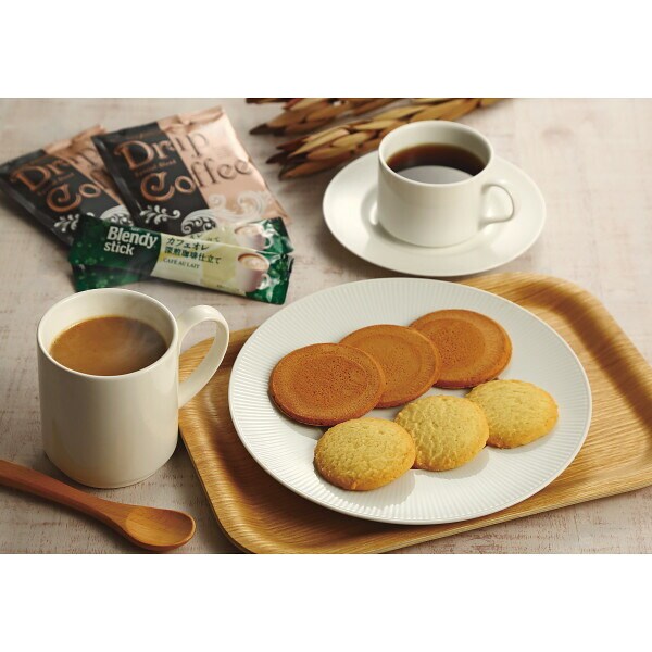 ドリップコーヒー8g×6、カフェオレ深煎珈琲(スティックタイプ)14g×3、クリームサンドクッキー×4、バタークッキー×3