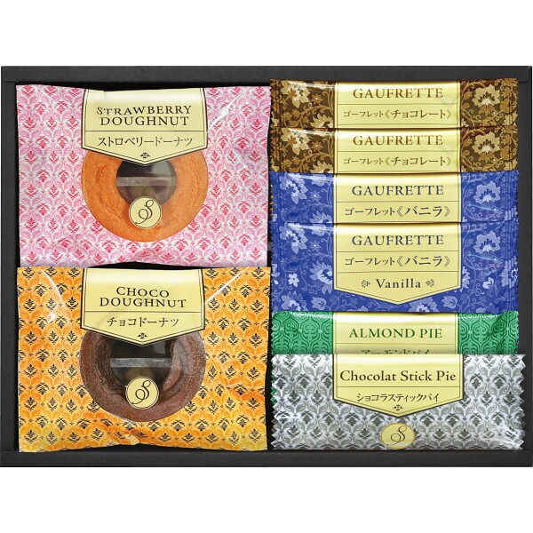 風味豊かなバニラクリームをサンドしたバニラゴーフレットや、上品な味わいに仕上げたチョコゴーフレット、何層にも重ねたパイ生地に細かく砕いたアーモンドを挟み、サックリと焼き上げたアーモンドパイ、チョコをサンドしたやさしい甘さのショコラスティックパイに、チョコとストロベリーの焼ドーナツをセットしました。お菓子好きな人にも満足な詰合せです。