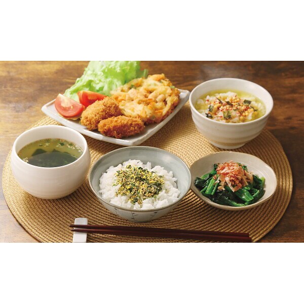 有明海産味付海苔(3切6枚)・のり玉子ふりかけ(4.5g×2)・鰹節削り(2g×4)・うめ茶漬け(4.3g×2)・わかめスープ(5.3g×2・粉末)・日清キャノーラ油400g×各1