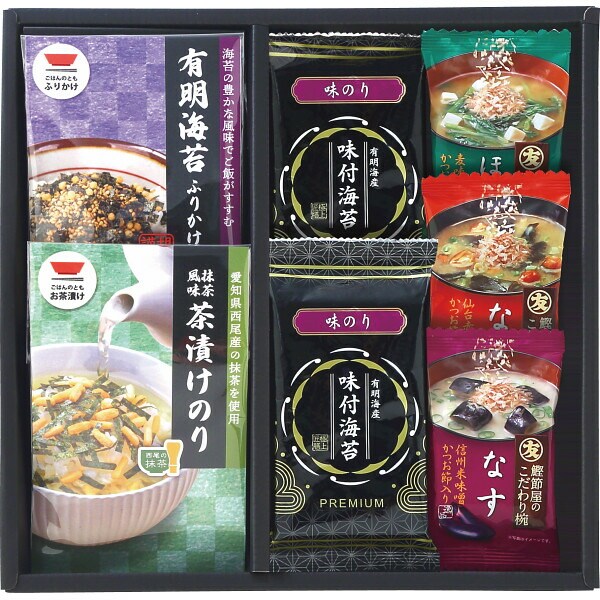 有明海苔ふりかけ(5g×2)×1、抹茶入のり茶漬け(5.6g×2)×1、有明海産味付海苔(8切×6枚)×2、フリーズドライ即席味噌汁(ほうれん草7.5g・なめこ5.9g・なす7.4g)×各1