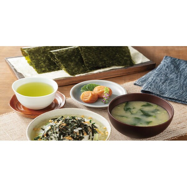 山本山焼海苔(板のり5枚)、山本山のり茶づけ×4(1袋6.2g詰)、栗原園煎茶ティーバッグ3g×8、紀州梅干し1粒×2、旅館のおみそ汁(粉末)9g×3