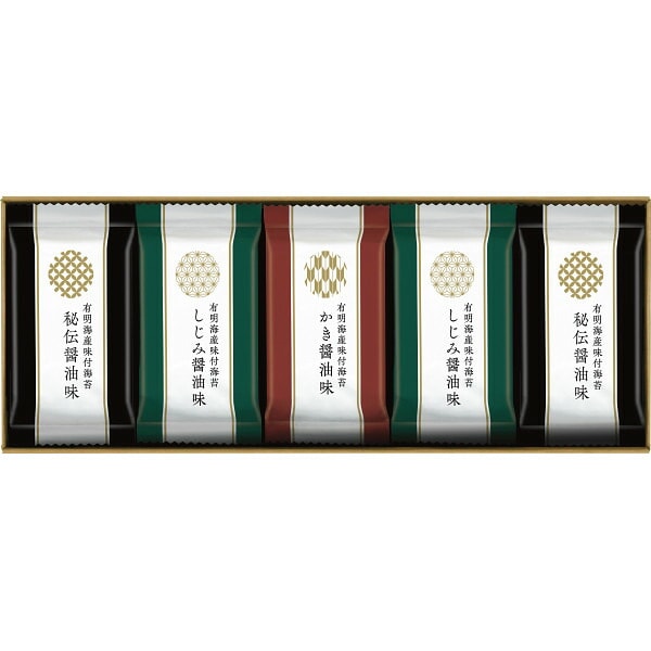 有明海産味付海苔秘伝醤油味(8切4枚)・有明海産味付海苔しじみ醤油味(8切4枚)×各6、有明海産味付海苔かき醤油味(8切4枚)×3 ※すべて海苔は有明海産