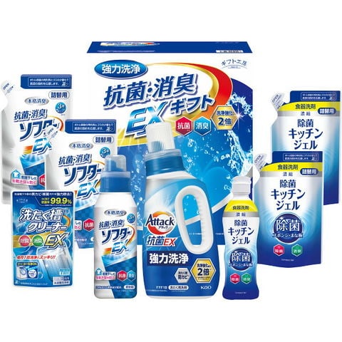 花王アタック抗菌EX750g・抗菌消臭ソフターEX350g・除菌キッチンジェル200ml・洗たく槽クリーナーEX100g×各1、抗菌消臭ソフターEX(詰替用)350g・除菌キッチンジェル(詰替用)160ml×各2