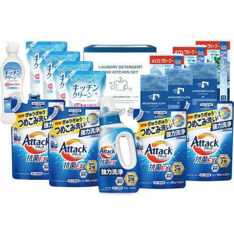花王アタック抗菌EX本体750g・キッチンクリーン250ml×各1、マイクロファイバークロス(約20×20cm)・メッシュクリーナー×各3、キッチンクリーン詰替200ml・花王アタック抗菌EX詰替590g×各4