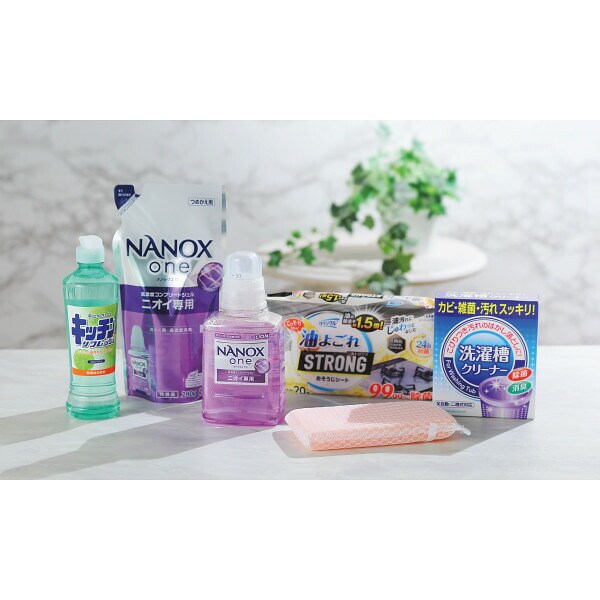 ライオンNANOXone380g・クリンクル油よごれおそうじシート(20枚)・洗濯槽クリーナー(50g×2包入)・ハーブエキス配合入浴料(30g×3包入)・ネットクリーナー×各1、キッチンリフレッシュコンパクト270ml×2、ライオンNANOXoneつめかえ用280g×3