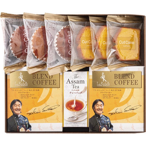 坂井宏行シェフ監修ドリップコーヒー(ブラジルブレンド・モカブレンド・キリマンジャロブレンド×各1)×2、アッサム紅茶ティーバッグ2g×2、カップケーキ(メープル)・カットケーキ(レモン)×各3