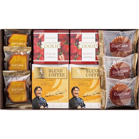 坂井宏行シェフ監修ドリップコーヒー(ブラジルブレンド・モカブレンド・キリマンジャロブレンド×各1)×2、カップケーキ(メープル)・カットケーキ(レモン)×各3、イチゴクッキー50g×2