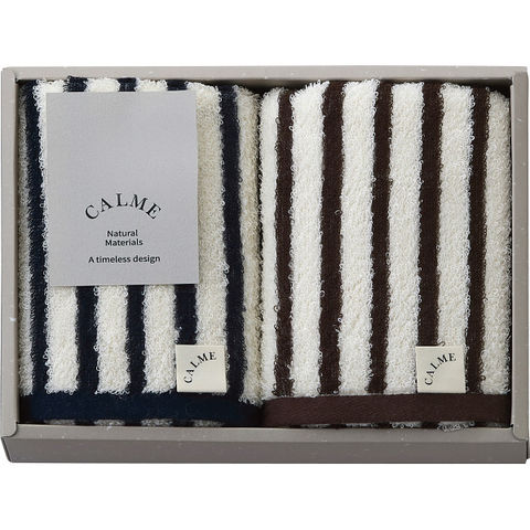 ・普遍的だけどおしゃれなストライプ柄。カラーもネイビーとブラウンとインテリアにも良く合う色を採用し、ユニセックスにご使用いただけるデザインです。・パイル部分にバンブーリヨセルを使用。コットンに比べてなめらかな肌触りです。またバンブーリヨセルはコットンと比べても吸水性が高く、普段使いにもとても重宝します。・パッケージは洗練され、落ち着いたアースカラーのベージュ。ギフトを受け取る方にも喜んでいただけるオシャレなパッケージです。