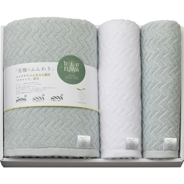 ユニチカのバイオマス素材『テラマック』を使用した、環境に配慮したタオルシリーズ。軽くて、ボリュームがあり、吸水性も抜群です。