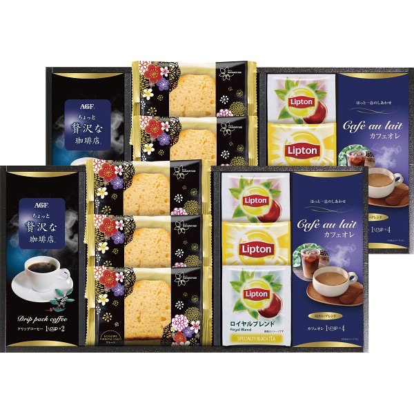 金澤兼六製菓オリジナルケーキ(プレーン)×6、リプトン イエローラベルティーバッグ2g・リプトン セイロンティーバッグ2.2g・リプトン ロイヤルブレンドティーバッグ2.2g・AGFちょっと贅沢な珈琲店スペシャルブレンド(ドリップ)(7g×2)・カフェオレ(スティック)(12g×4)×各2