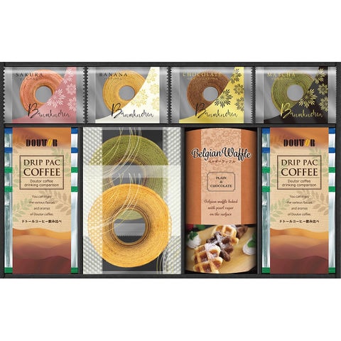 ミルクバウムクーヘン×1、宇治抹茶バウムクーヘン×1、ドトールドリップ珈琲(深煎りブレンド)7g×4、ドトールドリップ珈琲(キリマンジャロブレンド)7g×4、ミニバウムクーヘン(桜・バナナ・ベルギーショコラ・宇治抹茶)×各1、ベルギーワッフル(プレーン)×2、ベルギーワッフル(ショコラ)×1