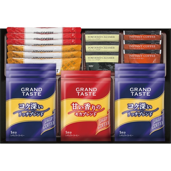キーコーヒードリップ(リッチブレンド1杯分×6・モカブレンド1杯分×2)、キーコーヒースティック(カフェオレ7g×3・カフェモカ7.8g×3)、キーコーヒーインスタントコーヒー2g×3、キーコーヒークリーミーパウダー2.5g×3
