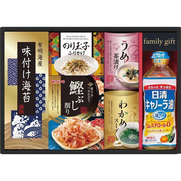 有明海産味付海苔(3切4枚)・のり玉子ふりかけ(4.5g×2)・鰹節削り(2g×4)・うめ茶漬け(4.3g×2)・わかめスープ(5.3g×2・粉末)・日清キャノーラ油400g×各1