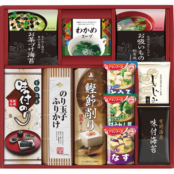 永谷園お茶づけ海苔(4.7g×5)・永谷園お吸いもの松茸風味(2.3g×6)(粉末)・わかめスープ(5.3g×2)(粉末)・有明海産味付のり(3切4枚)・のり玉子ふりかけ(4.5g×3)・まるじょう鰹節削り(1.5g×4)・アマノフリーズドライ(とうふおみそ汁10g・ほうれん草おみそ汁7g・なすおみそ汁9.5g)・しじみ醤油味付海苔(8切8枚)・有明海産味付海苔(8切8枚)×各1
