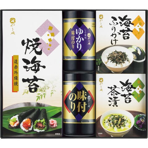 口どけのよい海苔に有機丸大豆醤油使用のたれで調味した味付海苔、三島食品の「ゆかり」を使用したたれで調味した赤しそ風味の味付海苔、遠赤外線でパリッと焼き上げた風味豊かな焼海苔、味付海苔と香ばしいごまの風味がおいしい海苔ふりかけ、焼海苔にごまやあられをブレンドした後味さわやかなお茶漬けをセットしたバラエティギフトです。