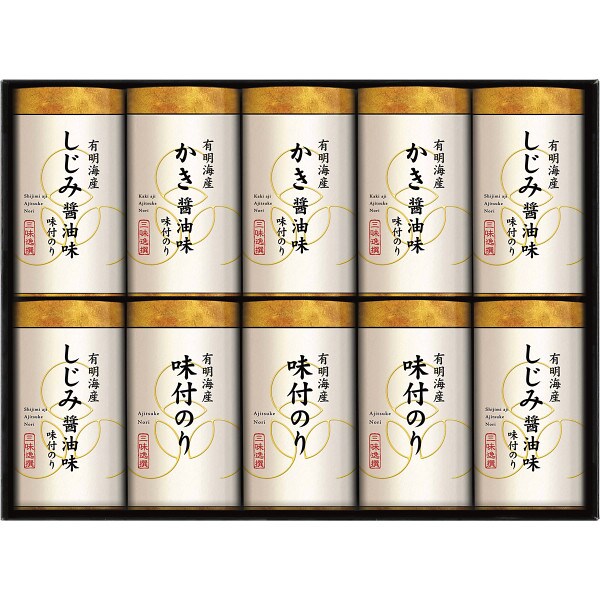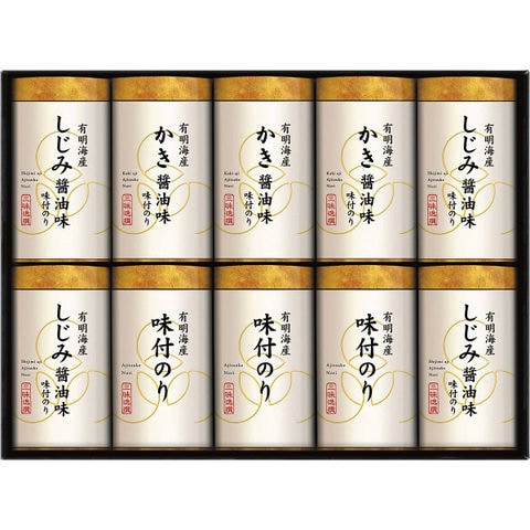有明海産の風味豊かな味付海苔としじみ醤油味、かき醤油で仕上げた味付海苔の3種類の味わいを楽しめるバラエティギフトです。