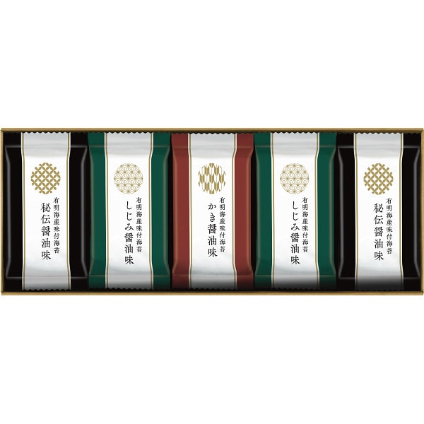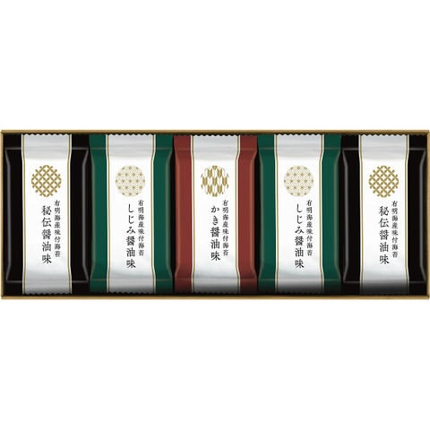有明海産味付海苔秘伝醤油味(8切4枚)・有明海産味付海苔しじみ醤油味(8切4枚)×各6、有明海産味付海苔かき醤油味(8切4枚)×3 ※すべて海苔は有明海産