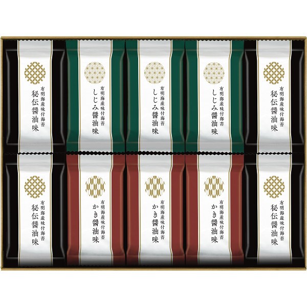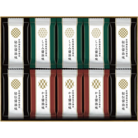 有明海産味付海苔秘伝醤油味(8切4枚)×12、有明海産味付海苔しじみ醤油味(8切4枚)・有明海産味付海苔かき醤油味(8切4枚)×各9 ※すべて海苔は有明海産