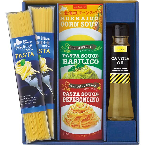 北海道小麦のパスタ80g×2、パスタシーズニング(ペペロンチーノ・バジリコ)各3g×各1、キャノーラ油90g×1、北海道コーンスープ16.5g×1