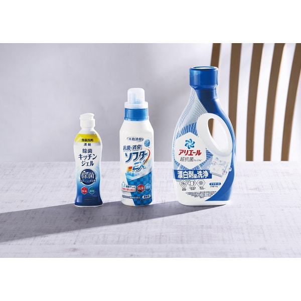 抗菌洗剤アリエールと、少量でたくさん洗える濃縮タイプの食器洗剤除菌ジェル、室内干しのイヤなニオイを防ぎ、ふっくら柔らかく仕上がる抗菌・消臭ソフターのギフトです。