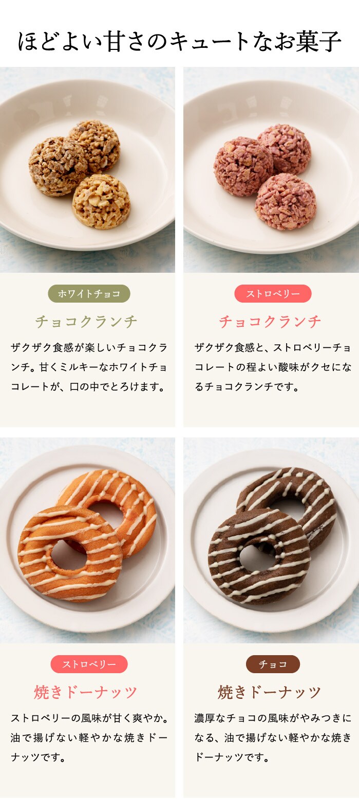 ●チョコクランチ(ホワイト・ストロベリー)×各3、焼きドーナツ(チョコ・ストロベリー)×各1