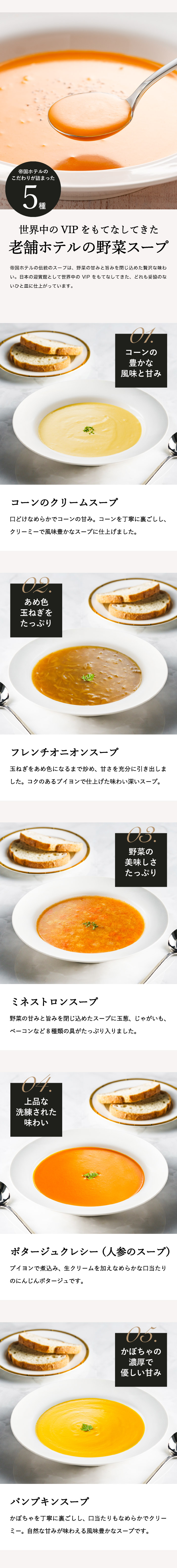 ●コーンのクリームスープ160g×2、フレンチオニオンスープ160g×2、ミネストロンスープ160g×2、パンプキンスープ160g×2、ポタージュクレシー(人参のスープ)160g×2(全て缶)