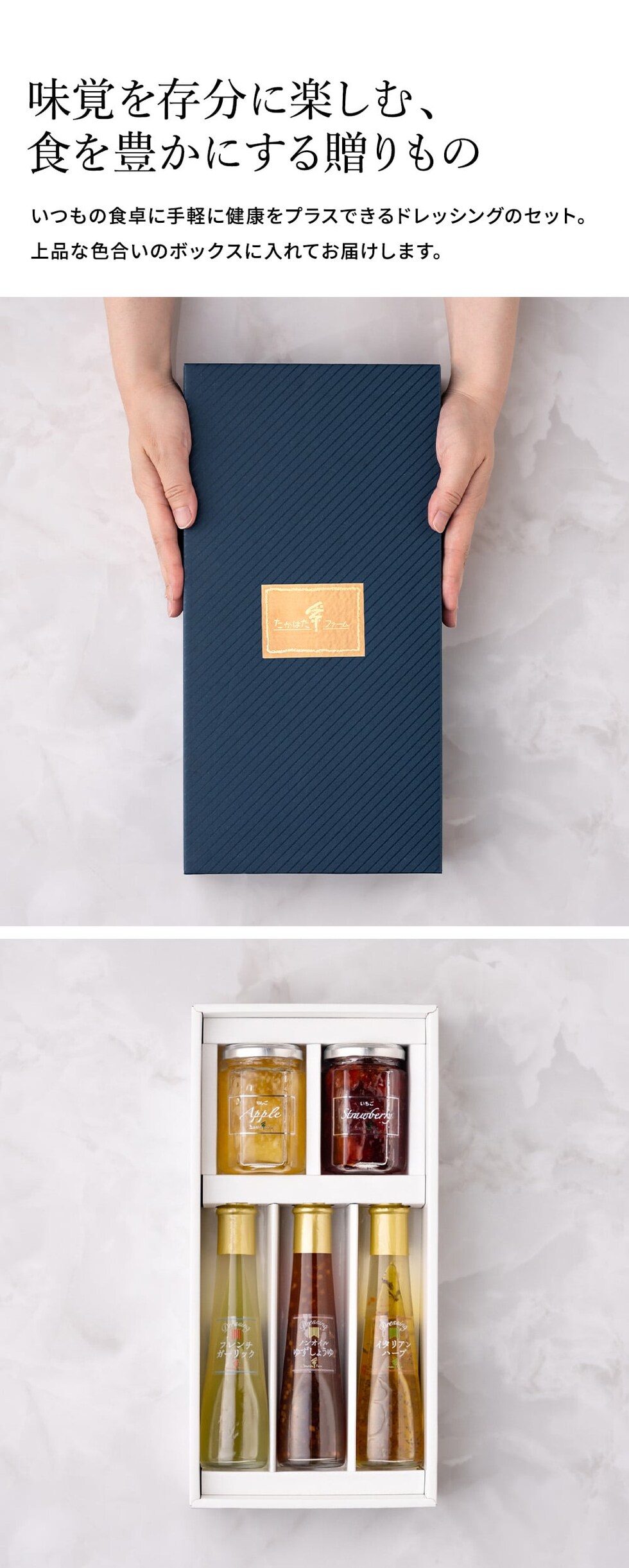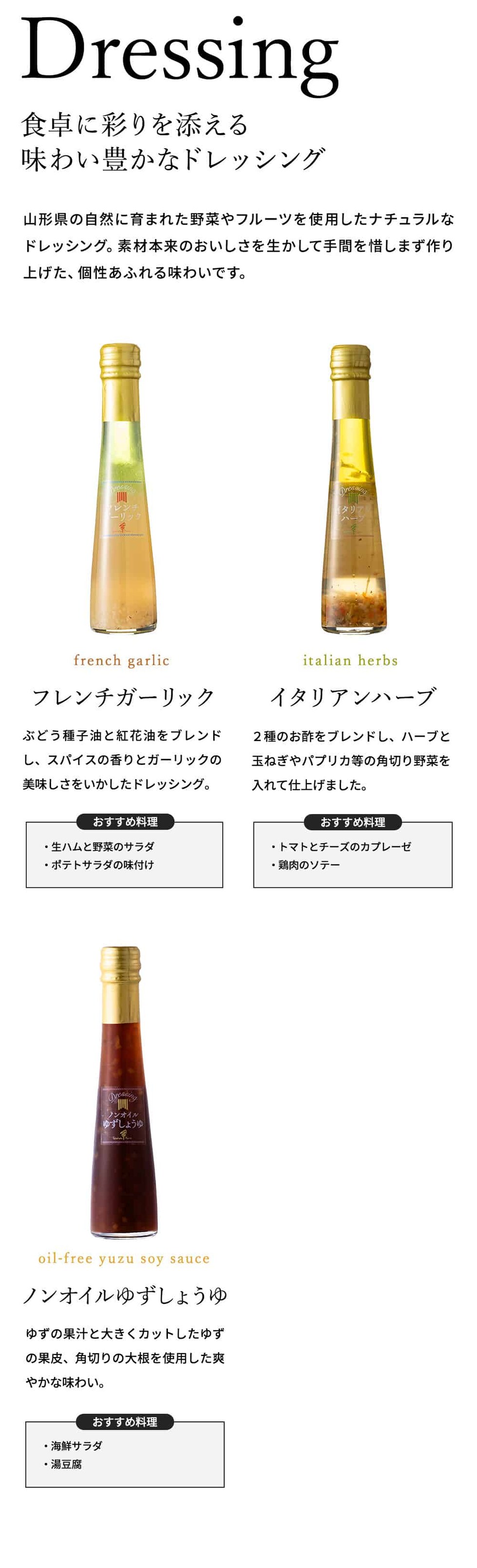 ●内容量:ジャム145g×2(りんご、いちご)、ドレッシング122ml×3(フレンチガーリック、ノンオイルゆずしょうゆ、イタリアンハーブ)