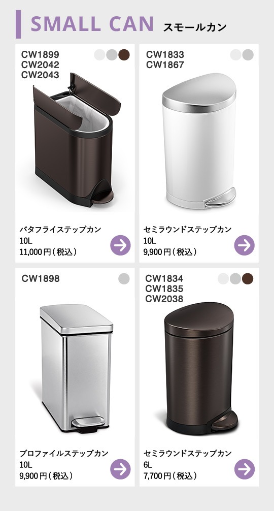 幅15.7cmとスリムでちょっとした隙間に置くことができ、スペースを有効活用できます。フタを開けるとライナーポケット(予備のゴミ袋を収納できるケース)があり、ゴミ袋の取り替えも簡単。丈夫なスチールペダルは長期間の使用にも耐え、またリッドショックテクノロジーでフタの動きを制御してゆっくりと静かに閉じられます。また、ステンレス製の表面にはバクテリアや菌、カビなどの繁殖を抑えるEPA登録済みの抗菌剤Agion?を使用して、フィンガープリントプルーフ(指紋がつきにくい)コーティングを施しています。(ステンレスモデルのみ)プラスチック製のインナーボックスは取り外し可能で、ゴミ捨てや掃除が楽に行えます。