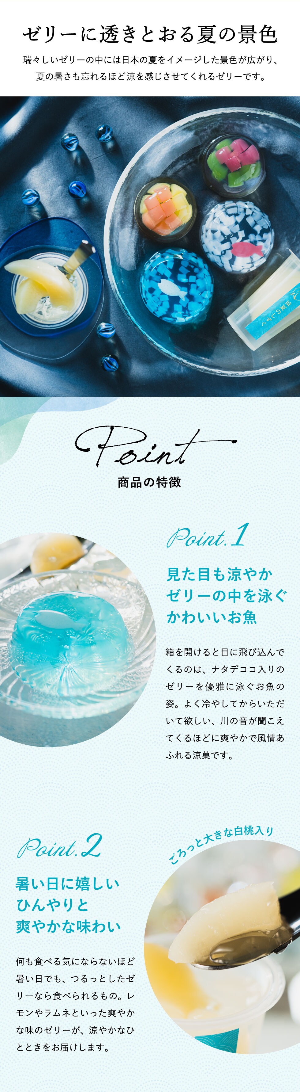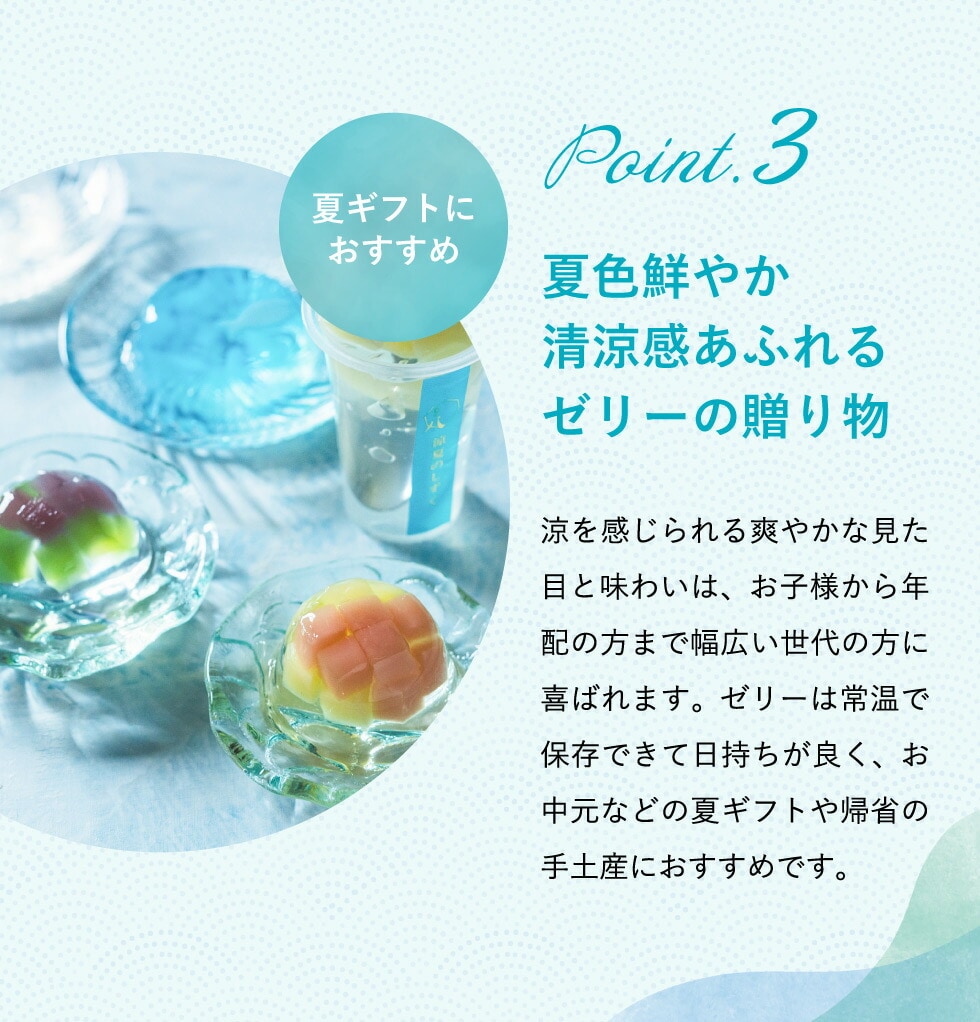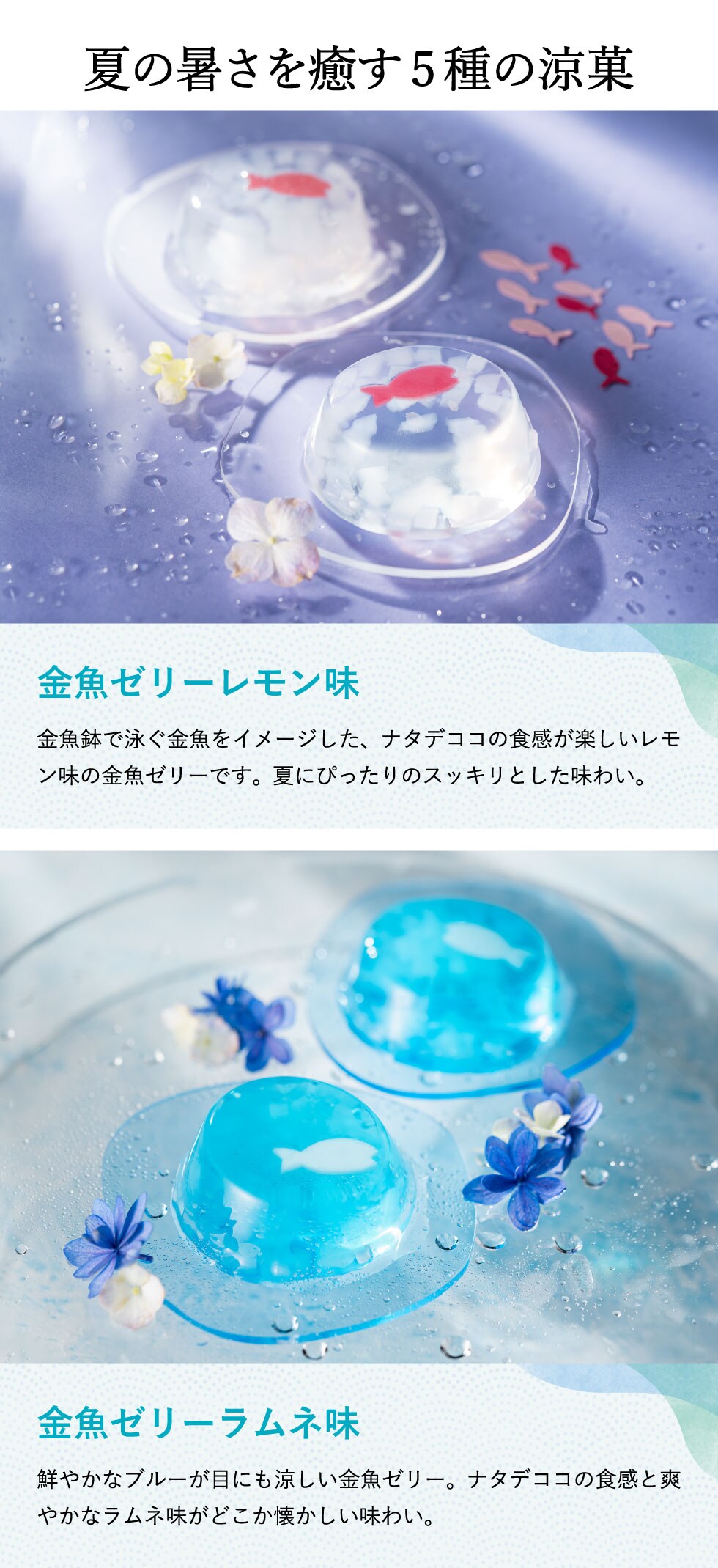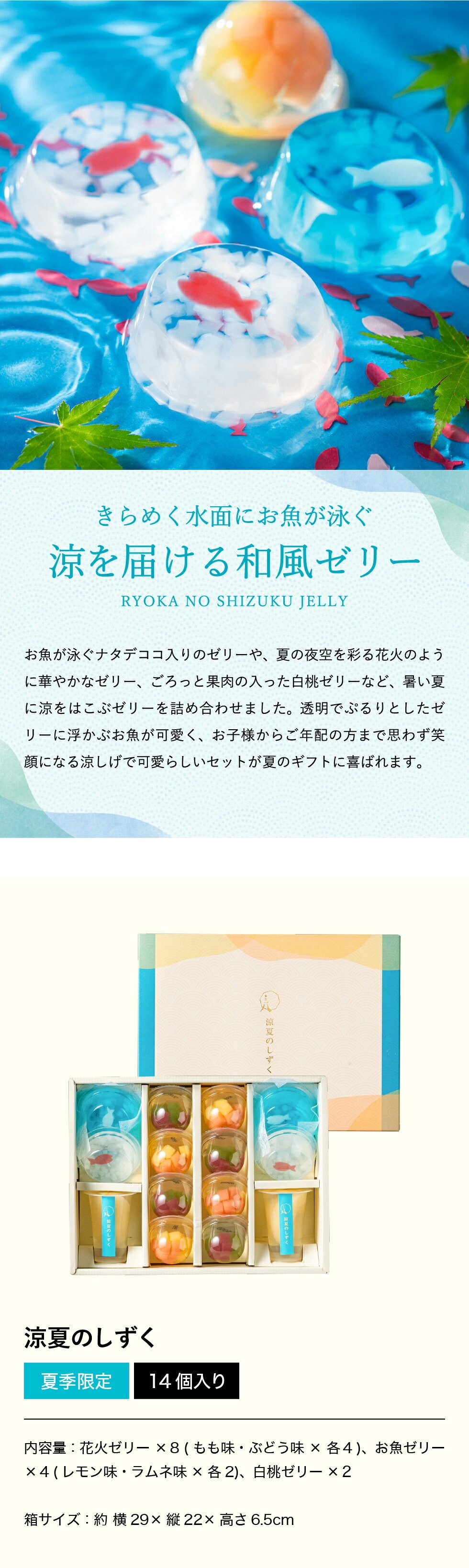 暑い夏に涼をはこぶ和風ゼリー。夏の空を彩る花火のようなゼリーやお魚が泳ぐゼリーが目にも涼しい涼菓詰め合わせ。