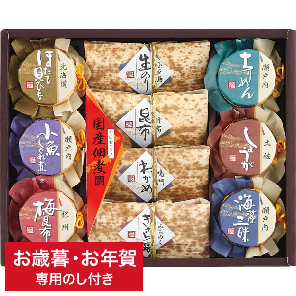 ●小豆島生のり100g・日高昆布100g・鳴門わかめ100g・みちのくきゃら蕗100g・北海道ほたて貝ひも60g・瀬戸内ちりめん45g・瀬戸内小魚しぐれ煮(小魚:瀬戸内産)40g・土佐しょうが45g・紀州梅昆布(梅:紀州産)80g・瀬戸内海藻三昧90g×各1