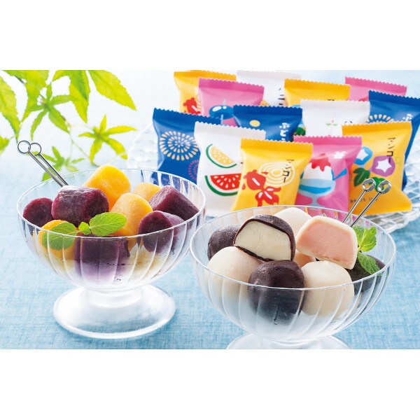 京都の夏祭りをイメージしたパッケージ。夏の風情をお届けするギフトです。かわいい京都の絵柄が入ったプチアイスは定番のチョコバニラと3種類のフルーツアイス。夏のひと時をお楽しみください。