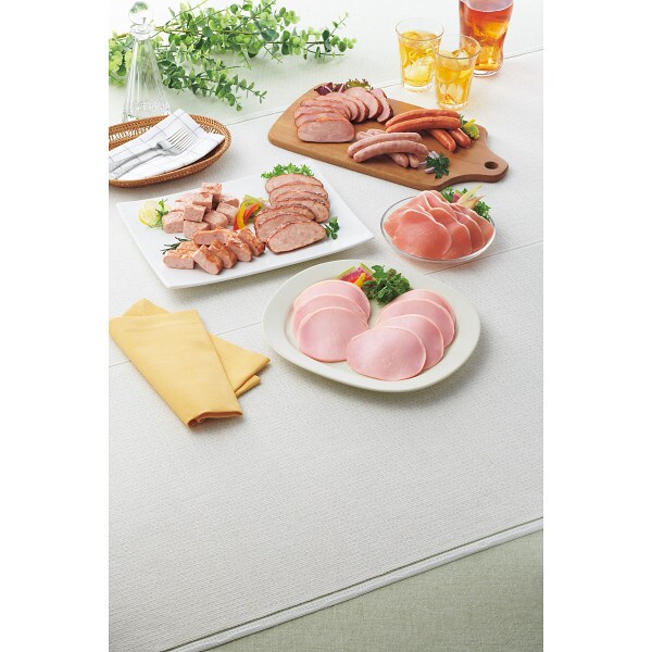●商品内容:特選(ロースハム180g・炙り焼ローフ160g・二段加熱あらびきステーキ110g・あらびき燻しウインナー80g)、焼豚二段加熱仕立て160g、しっとりロース生ハム45g