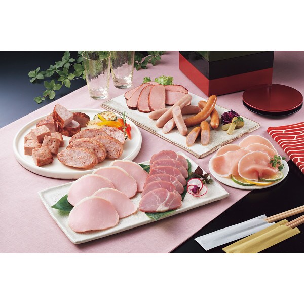 ●商品内容:特選(ロースハム180g、あらびきヴルスト160g、特選二段加熱あらびきステーキ110g、あらびき燻しウインナー80g×2)、焼豚二段加熱仕立て160g