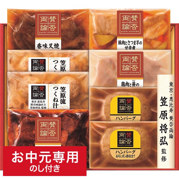 ●商品内容:賛否両論(笠原流つくね汁200g・ハンバーグおろしポン酢仕立て(豚肉・牛肉使用)120g×各2、香味叉焼180g、牛とろとろ煮・鶏肉と蕪の豆乳ソース仕立て・豚肉とさつま芋の甘辛煮各150g)