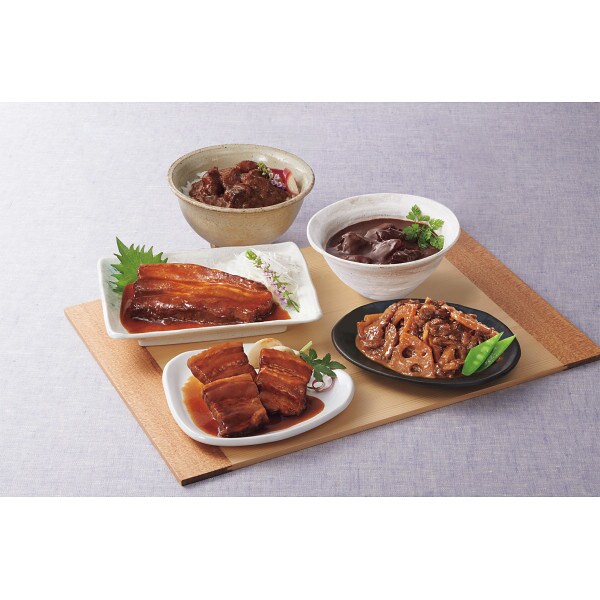 ●商品内容:ビーフシチュー180g、牛カリー170g、牛肉と蓮根の甘辛煮・豚角煮各120g、豚肉の味噌煮込み100g