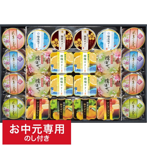 ●商品内容:珈琲ゼリー52g×2、輪島塩ぜりぃ52g×2、水羊羹小倉60g×4、水羊羹練り60g×2、水羊羹抹茶60g×2、輪島塩入り檸檬ゼリー75g×4、プレミアムマンゴープリン75g×2、蜂蜜入り柚子ぜりぃ75g×2、梅酒ぜりぃ75g×4