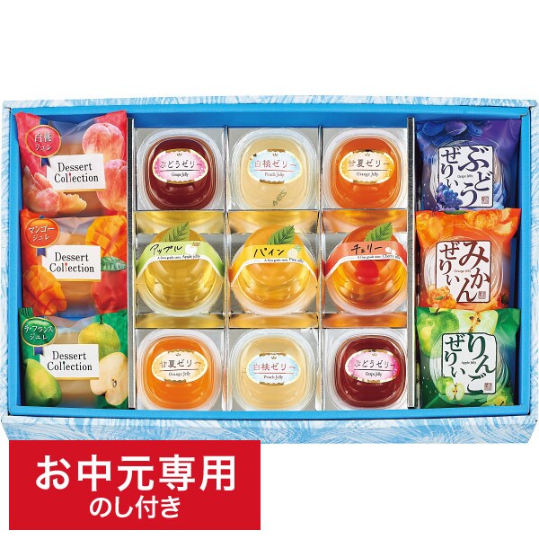 瑞々しい果肉をたっぷり使ったジュレや新鮮な果汁を丸ごととじこめた甘夏ゼリー・白桃ゼリー・ブドウゼリー。モチモチ食感の葛ゼリーなどの多彩なゼリーの詰め合わせです。