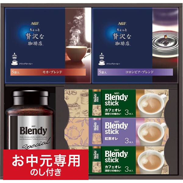 ●商品内容:ちょっと贅沢な珈琲店ドリップコーヒー(モカブレンド・コロンビアブレンド各5P)、ブレンディインスタントコーヒー(スペシャルテイスト70g)、ブレンディスティック(カフェオレ3P×2、紅茶オレ3P)