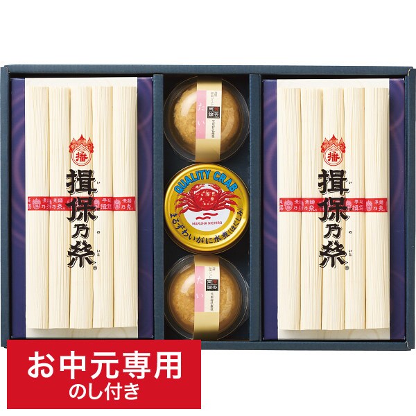 ●商品内容:賛否両論 海鮮和風「たい」ジュレ70g×2、マルハニチロまるずわいがに(ほぐしみ)55g×1、手延素麺揖保乃糸(上級品)(50g×5束)×2