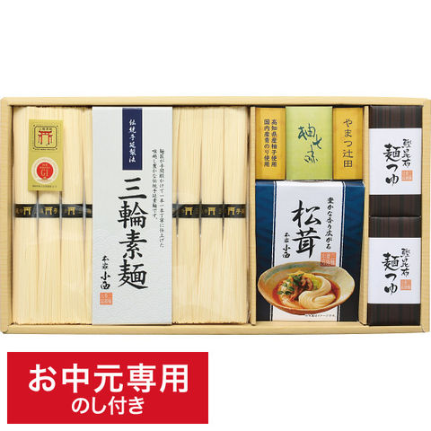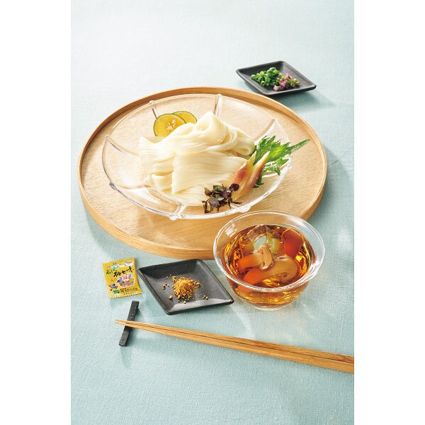 国内産の柚子皮を使用した柚七味と、松茸つゆを詰め合せた三輪素麺ギフトセットです。