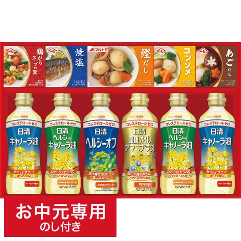 ●商品内容:日清キャノーラ油350g・日清ヘルシーキャノーラ油350g×各2、日清ヘルシーオフ350g・日清健康オイルアマニプラス350g・マルトモ直火焼本かつおだしの素(顆粒)50g・焼塩(20g×3)・コンソメ(顆粒)(8g×4)・鶏がらスープの素(顆粒)(8g×4)・あごだし(顆粒)(8g×4)×各1